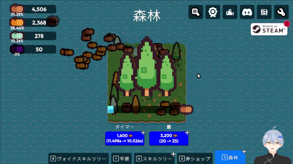 放置するだけで木材を獲得できるシステム、森林をスキルツリーで解放することが出来る。