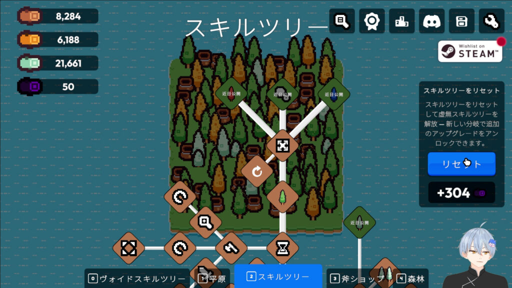 伐採して獲得した木材を利用してスキルツリーを進めていく。